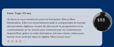 Le programme complet pour apprendre à créer et lancer ton premier produit digital. Voici ce que tu obtiendras en rejoignant AFRICA NEXT GENERATIONS™